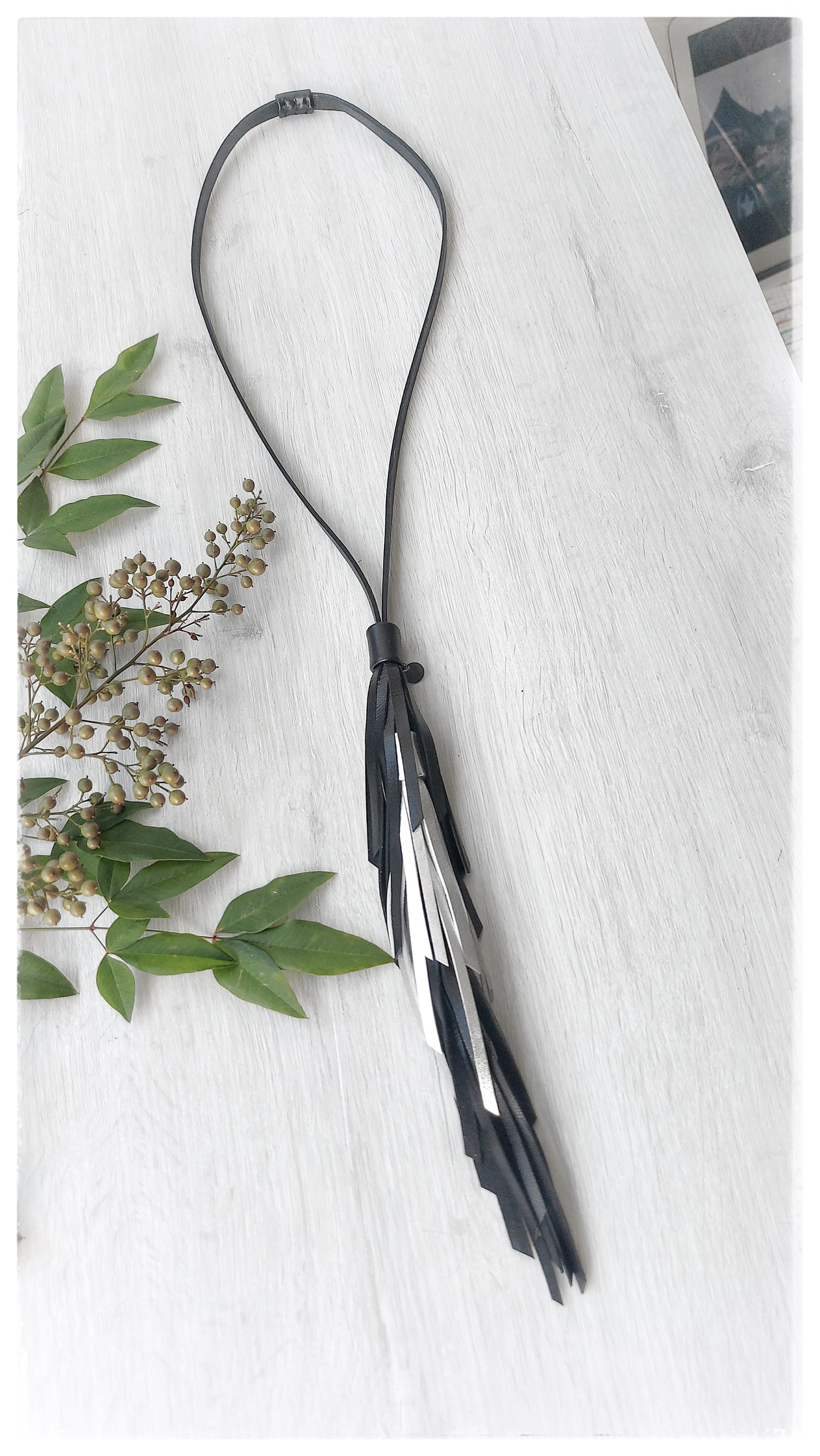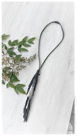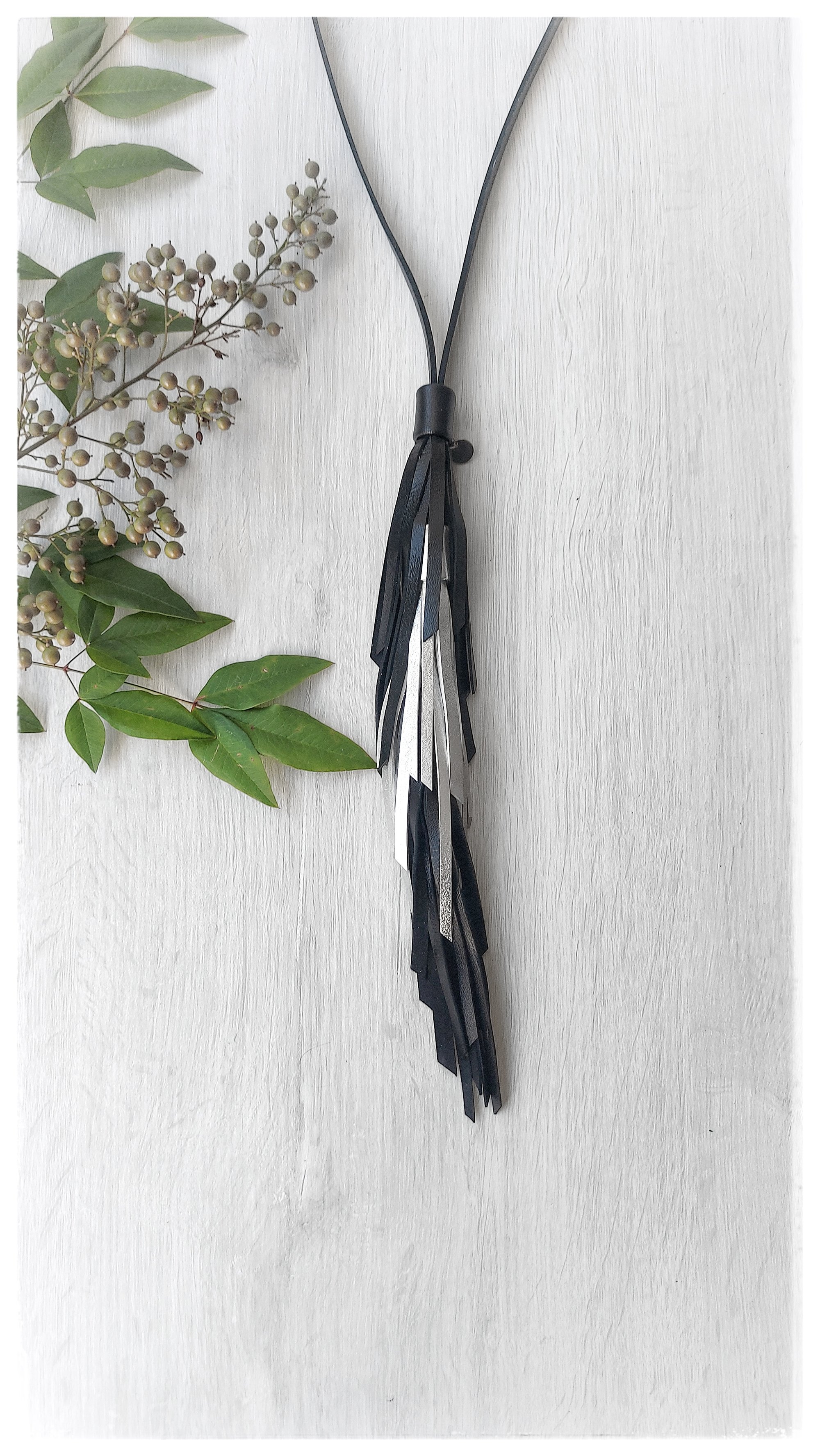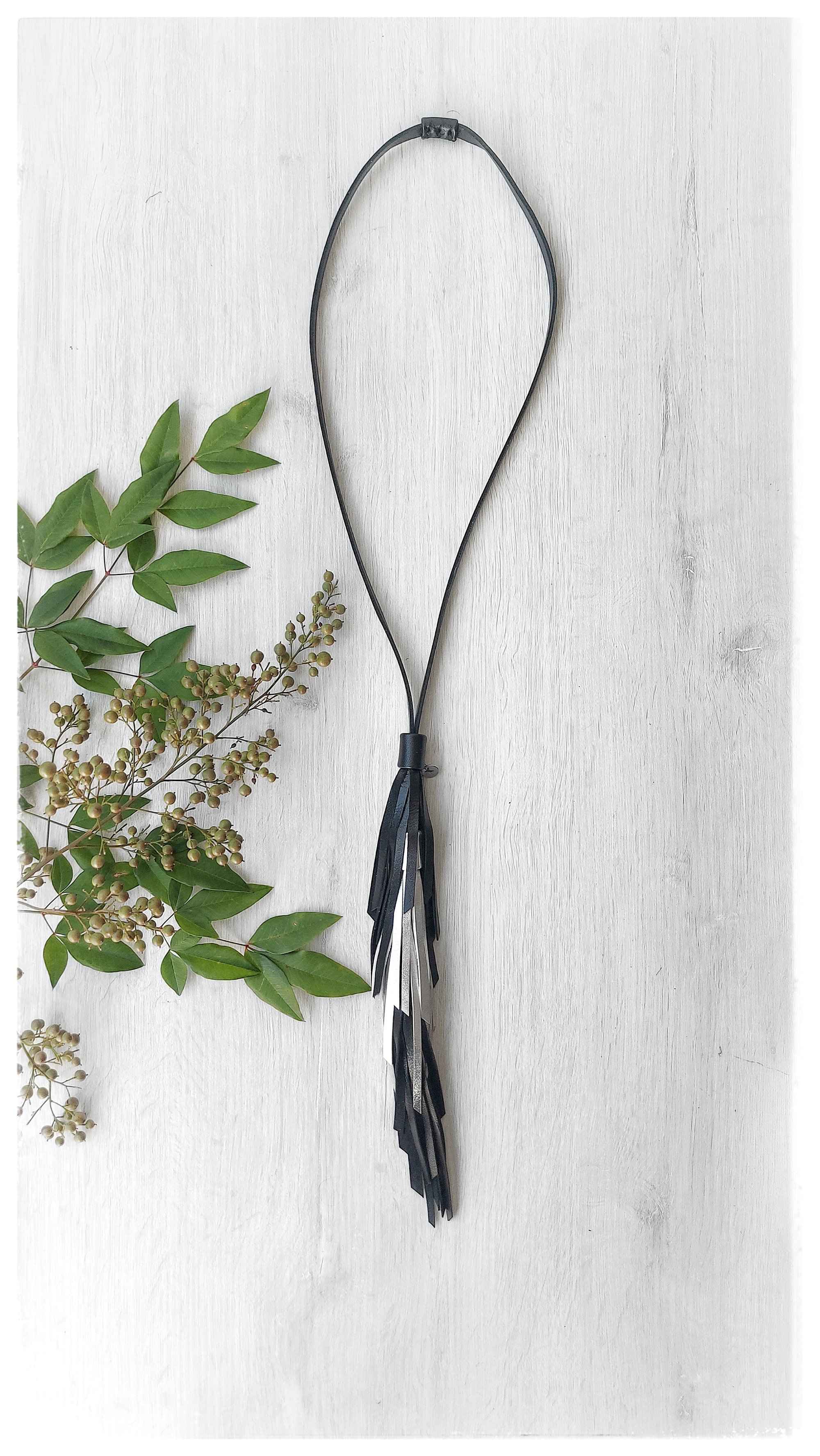 - The necklace is characterized by a central cascade of tapered leather tassels, mounted on a doubled leather lace. The tassels are made with a unique cut, sewn by hand. One size fits all.