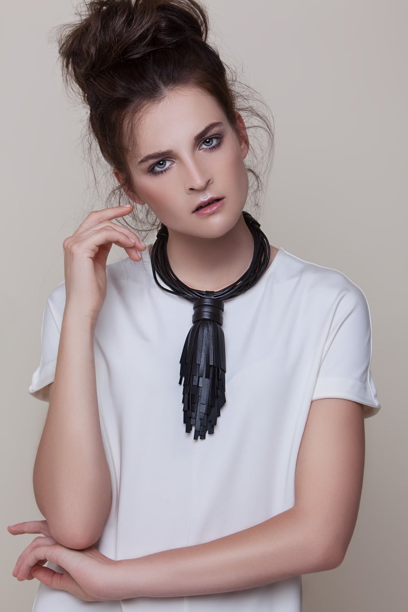 multi-strand black leather collier.