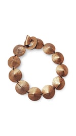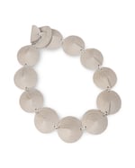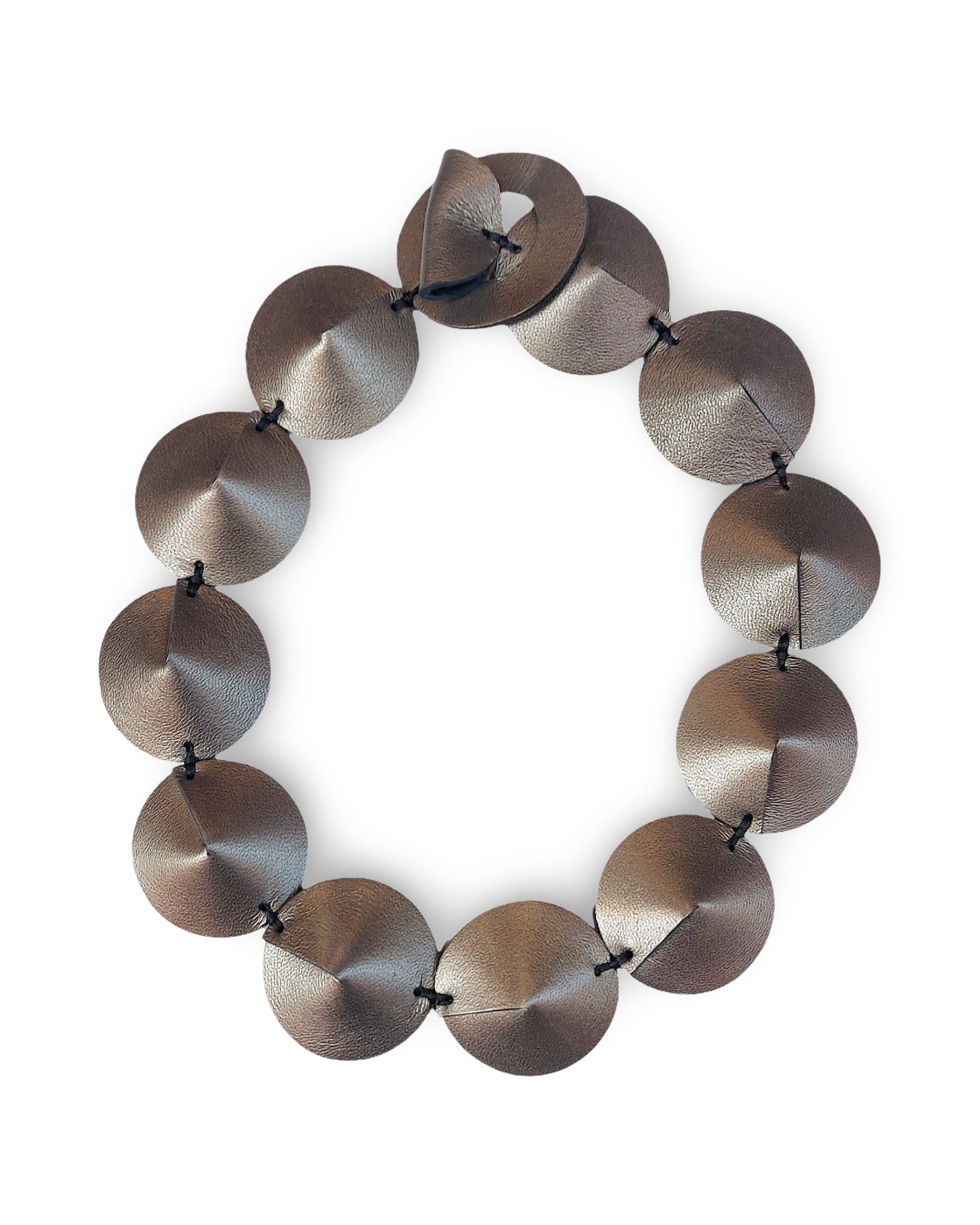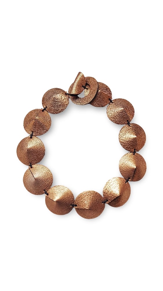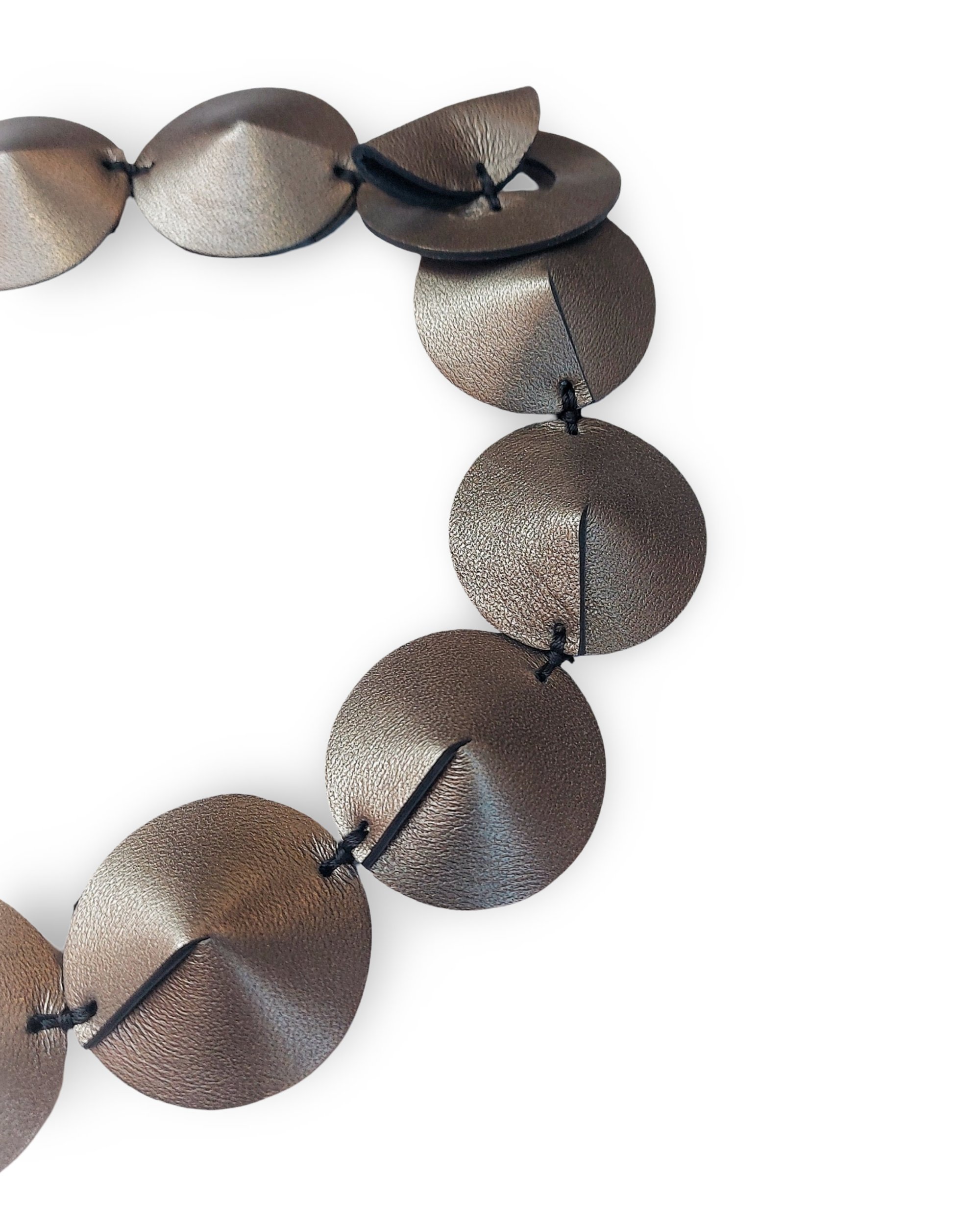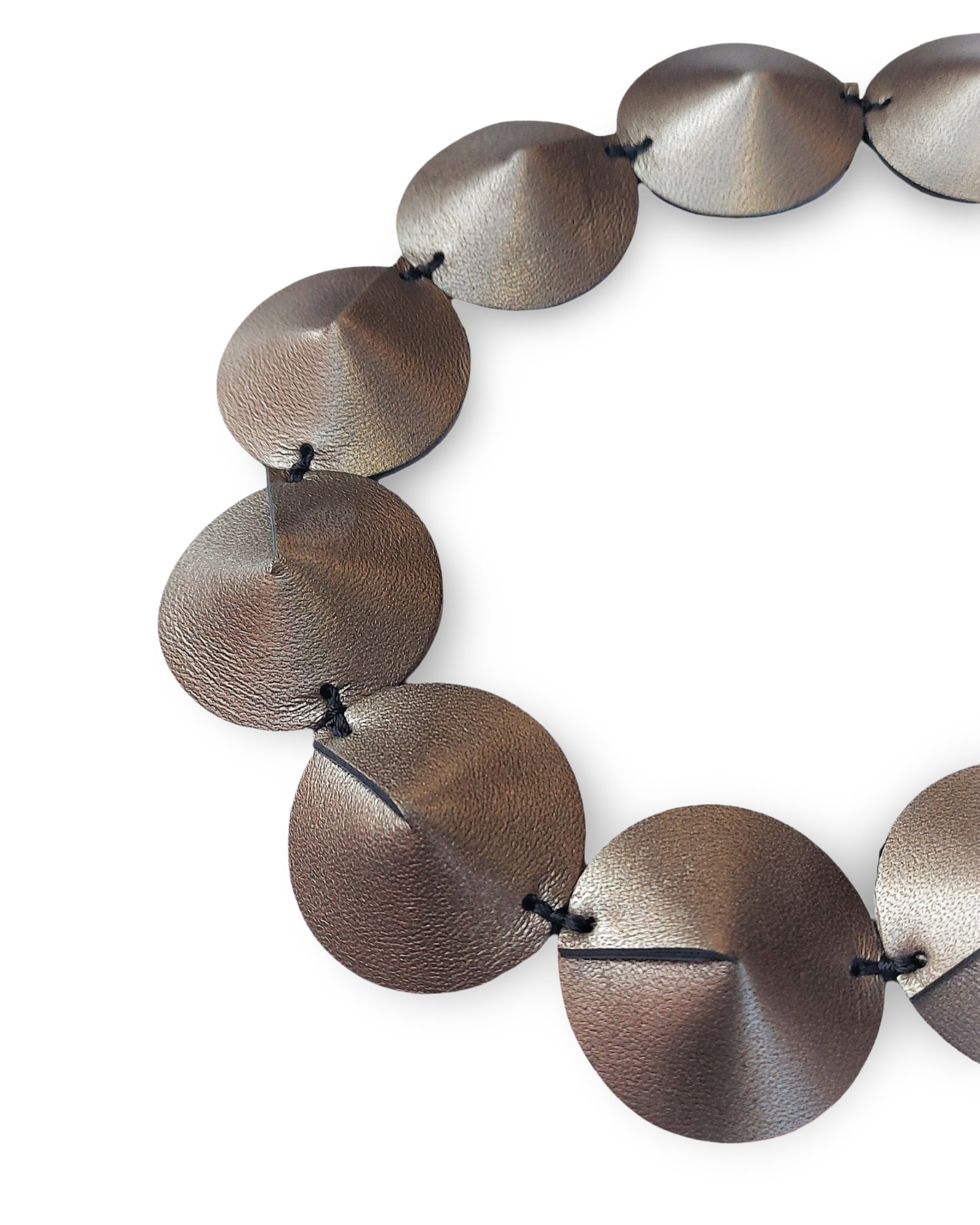 The choker-style necklace is characterized by a series of leather discs, stitched together like a tortoise shell, almost forming armor around the neck.