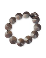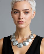 La collana, modello girocollo, è caratterizzata da una serie di dischi in pelle, cuciti come il carapace di una testuggine, quasi a formare un'armatura attorno al collo.