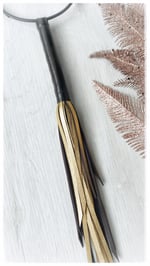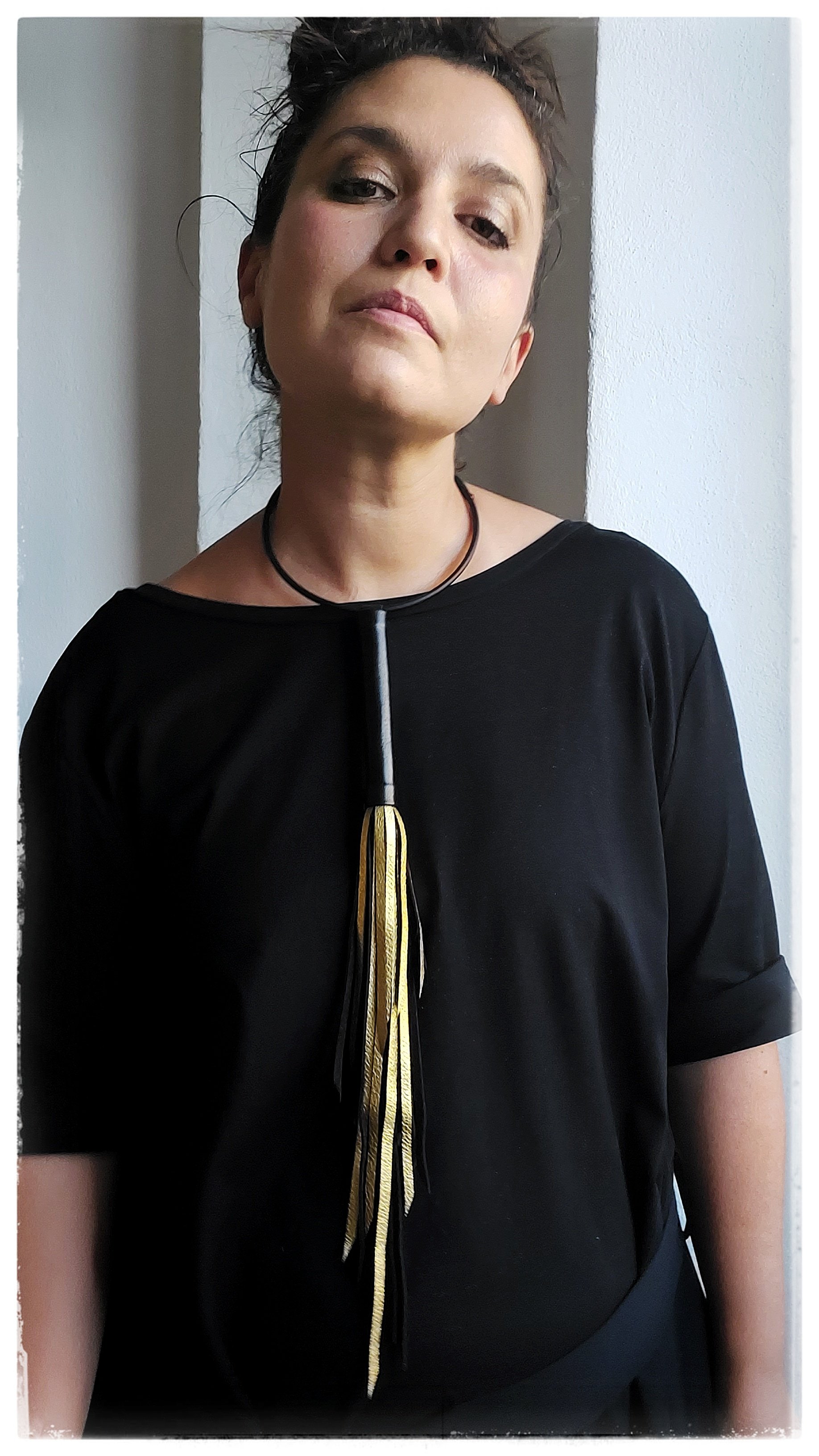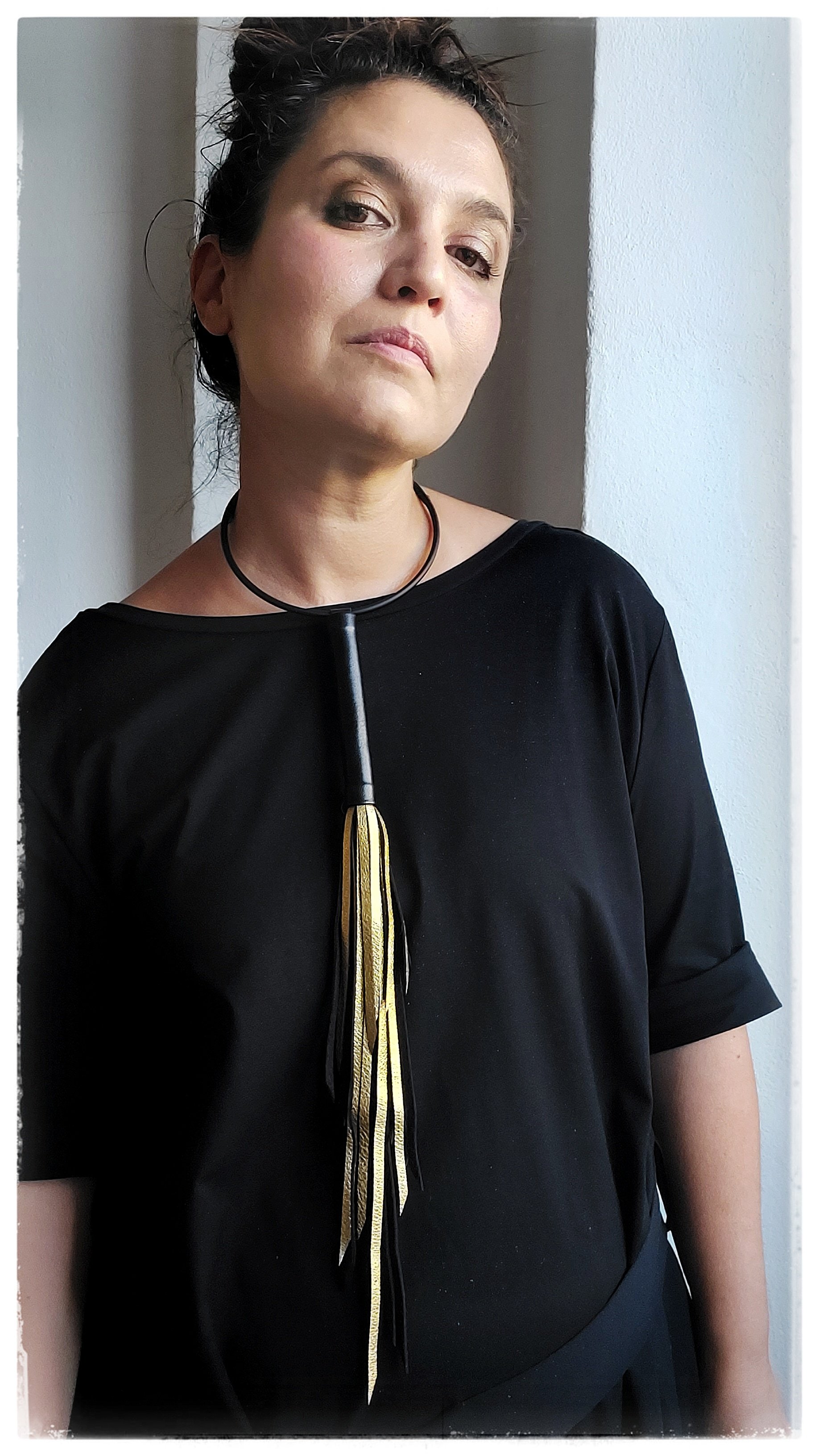- Collana in pelle dal design moderno e pulito, realizzata artigianalmente con morbida e pregiata pelle italiana accuratamente selezionata e proveniente esclusivamente da stock fine serie e scarti di lavorazione. Collier elastico, regolabile, realizzato in acciaio armonico e rivestito in caucciù.