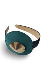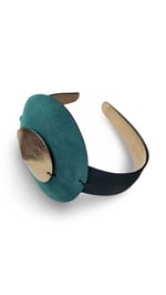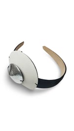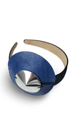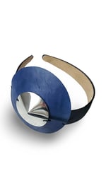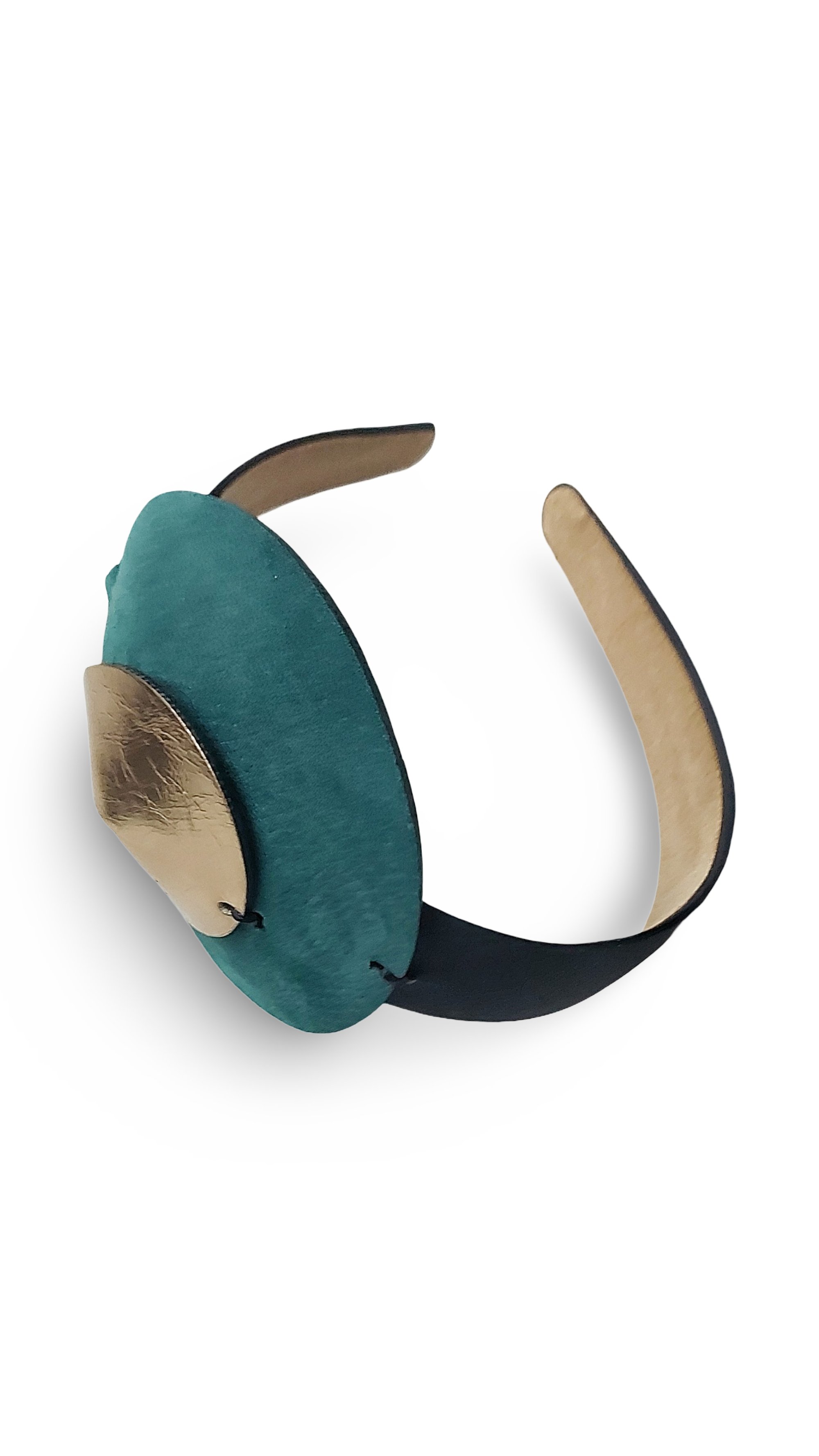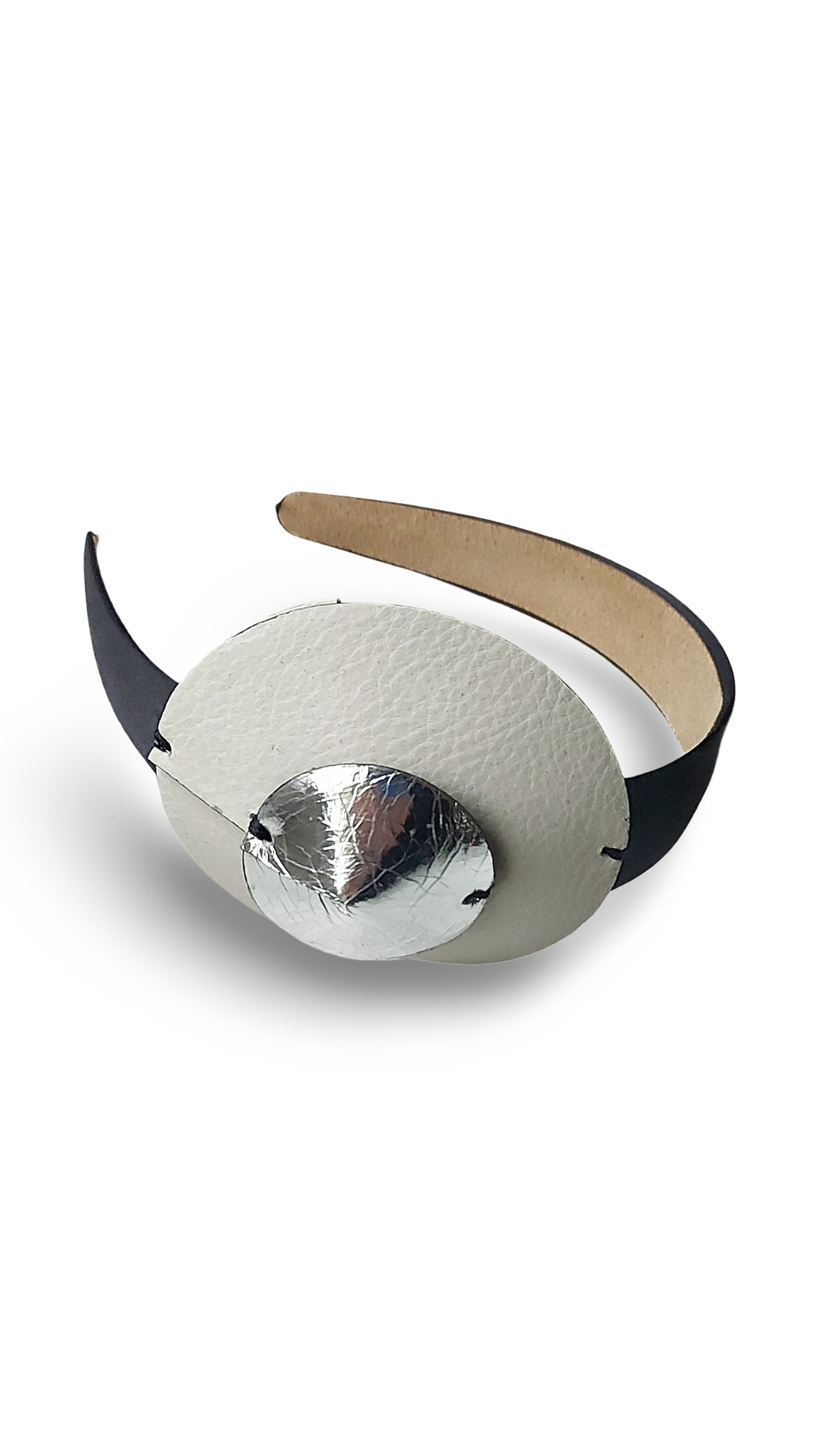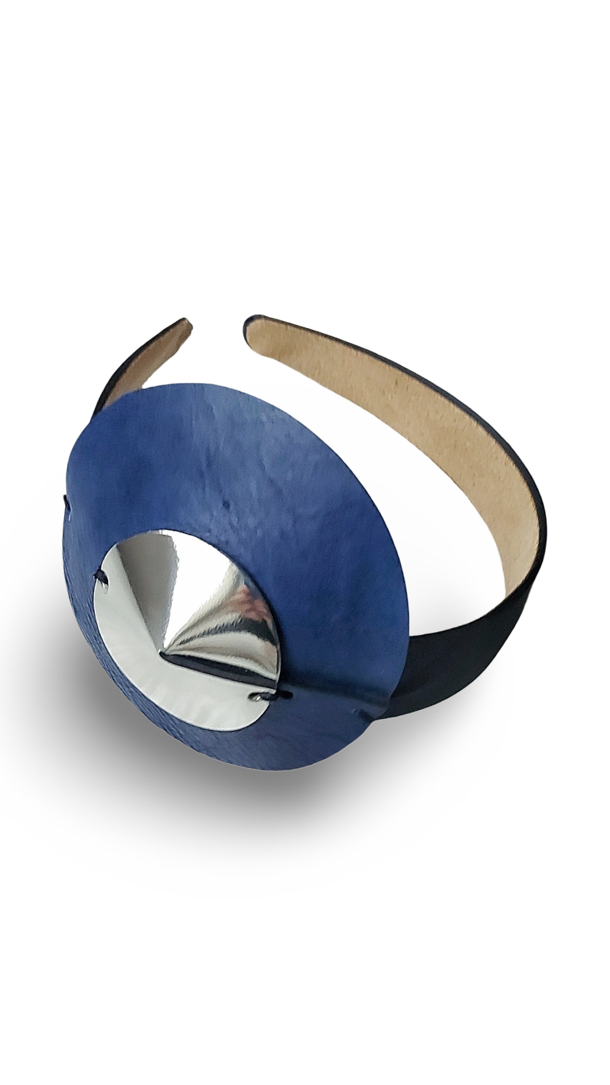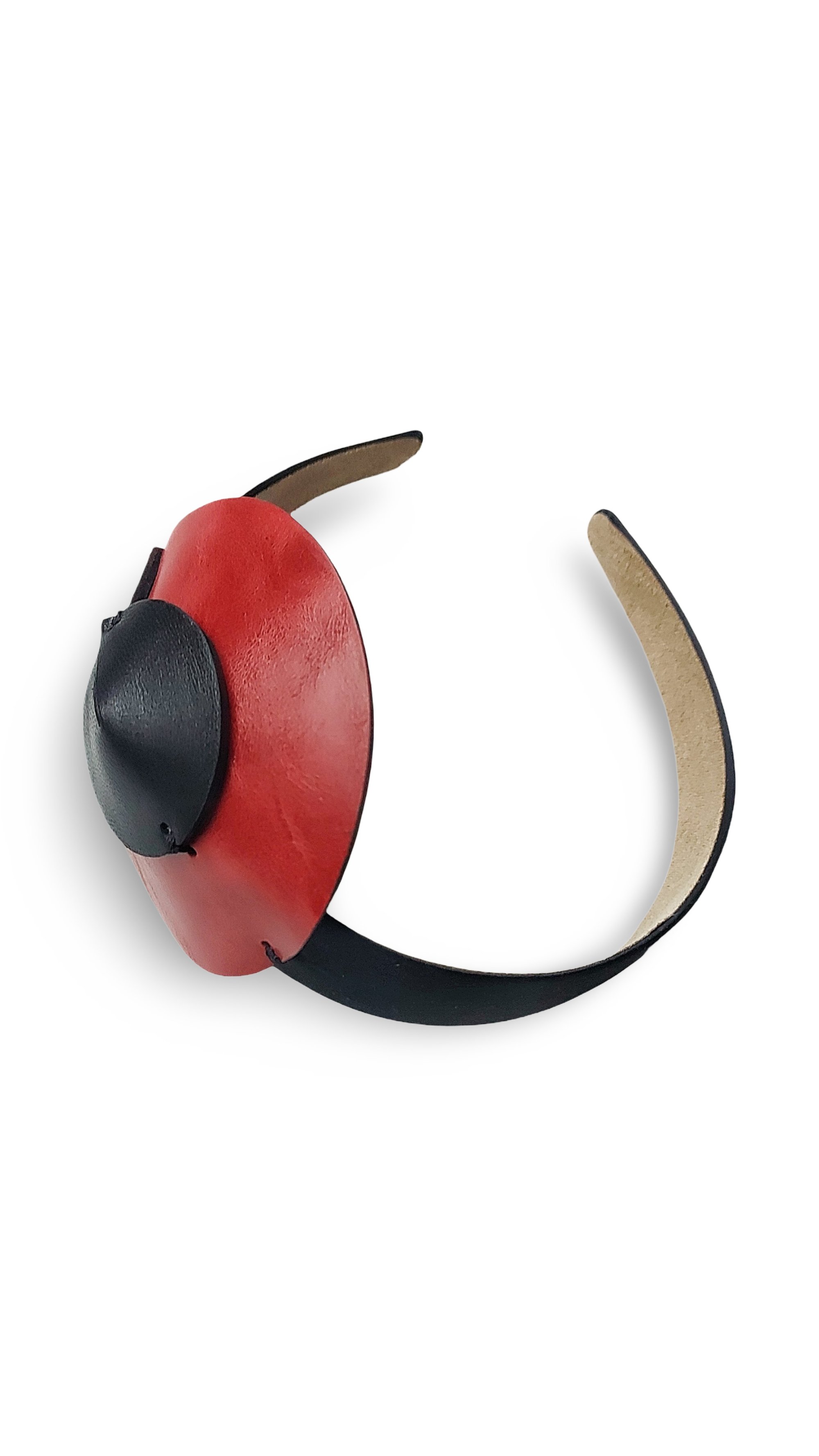 - Mini pagoda headband in leather, with an original and ironic style. They are handcrafted using soft, high-quality Italian leather, which is exclusively sourced from end-of-line stock and production scraps, as well as leather hide; the base is plastic covered in black polyester. They are extremely light and comfortable. The discs are created using a die-cutter, individually hand-dyed along the edges, and then hand-stitched.