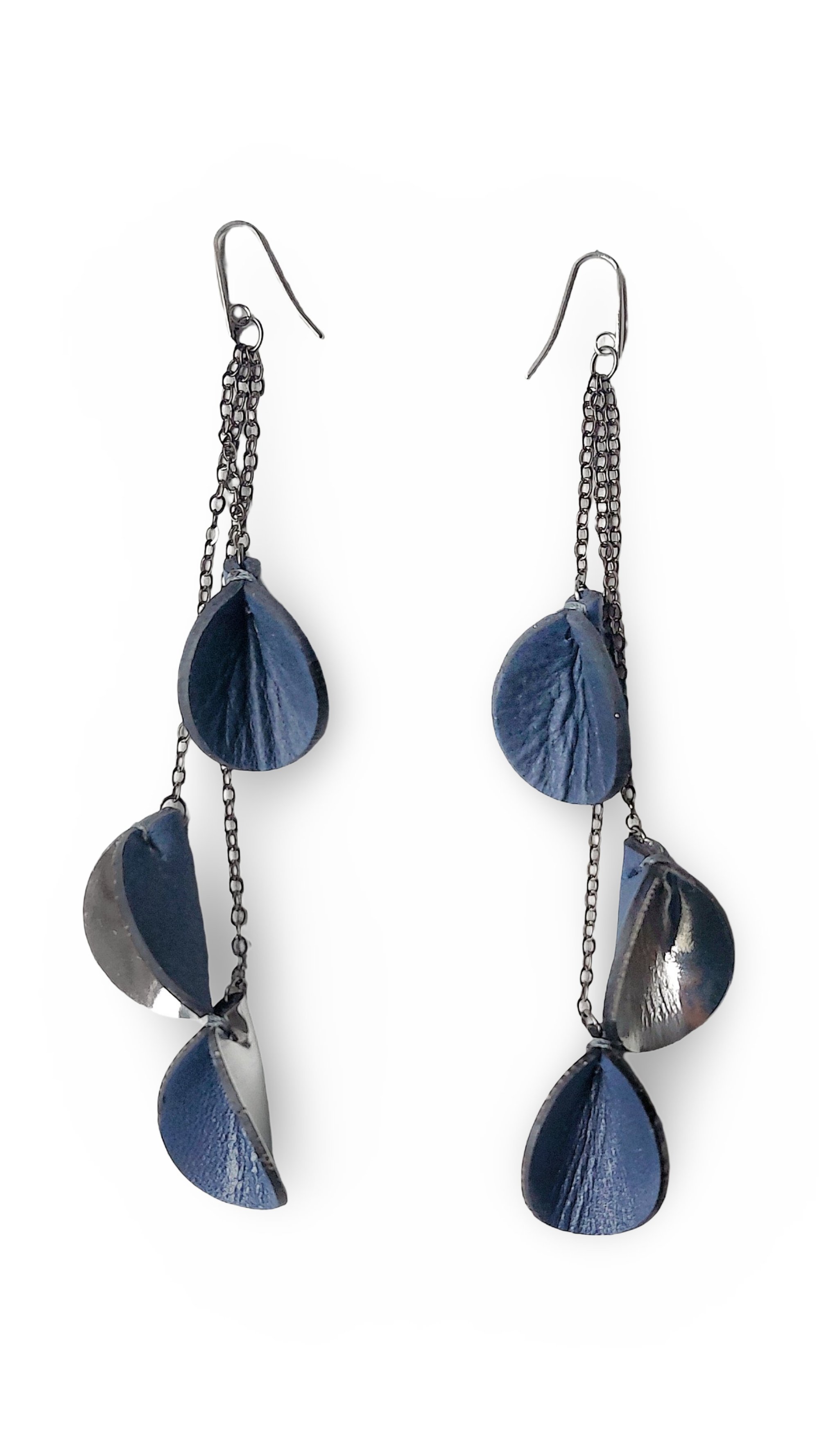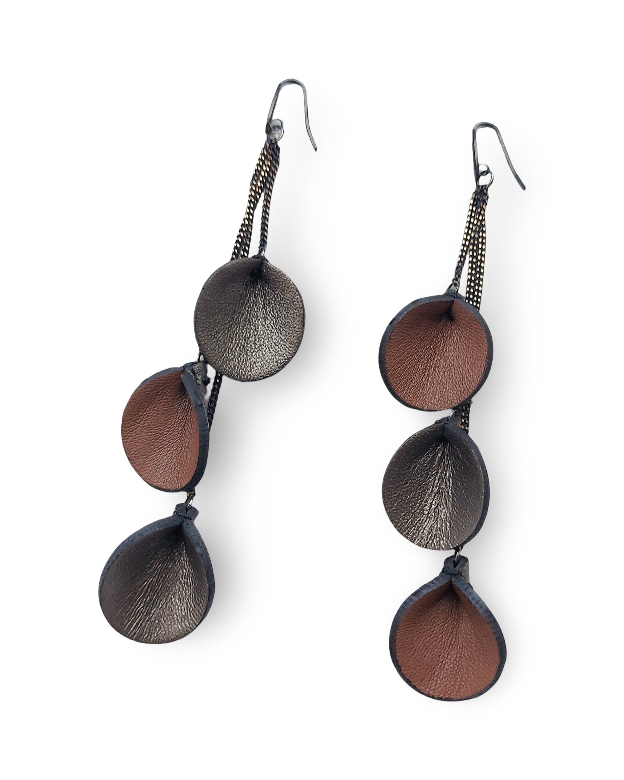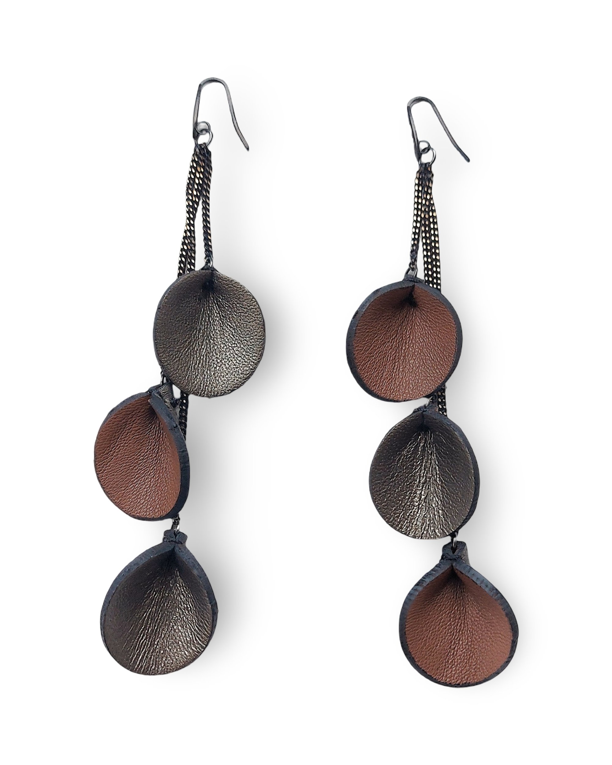 - Dangling earrings in leather with steel hooks and brass chains, featuring a refined and elegant style. They are handcrafted using soft, high-quality Italian leather, which is exclusively sourced from end-of-line stock and production scraps, as well as leather hide; hypoallergenic steel hooks; nickel-free brass chains.