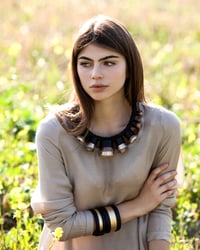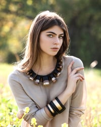 - Collana scultura con elementi decorativi in pelle dallo stile forte e d'impatto, realizzata artigianalmente con morbida e pregiata pelle italiana accuratamente selezionata e proveniente esclusivamente da stock fine serie e scarti di lavorazione e cuoio.