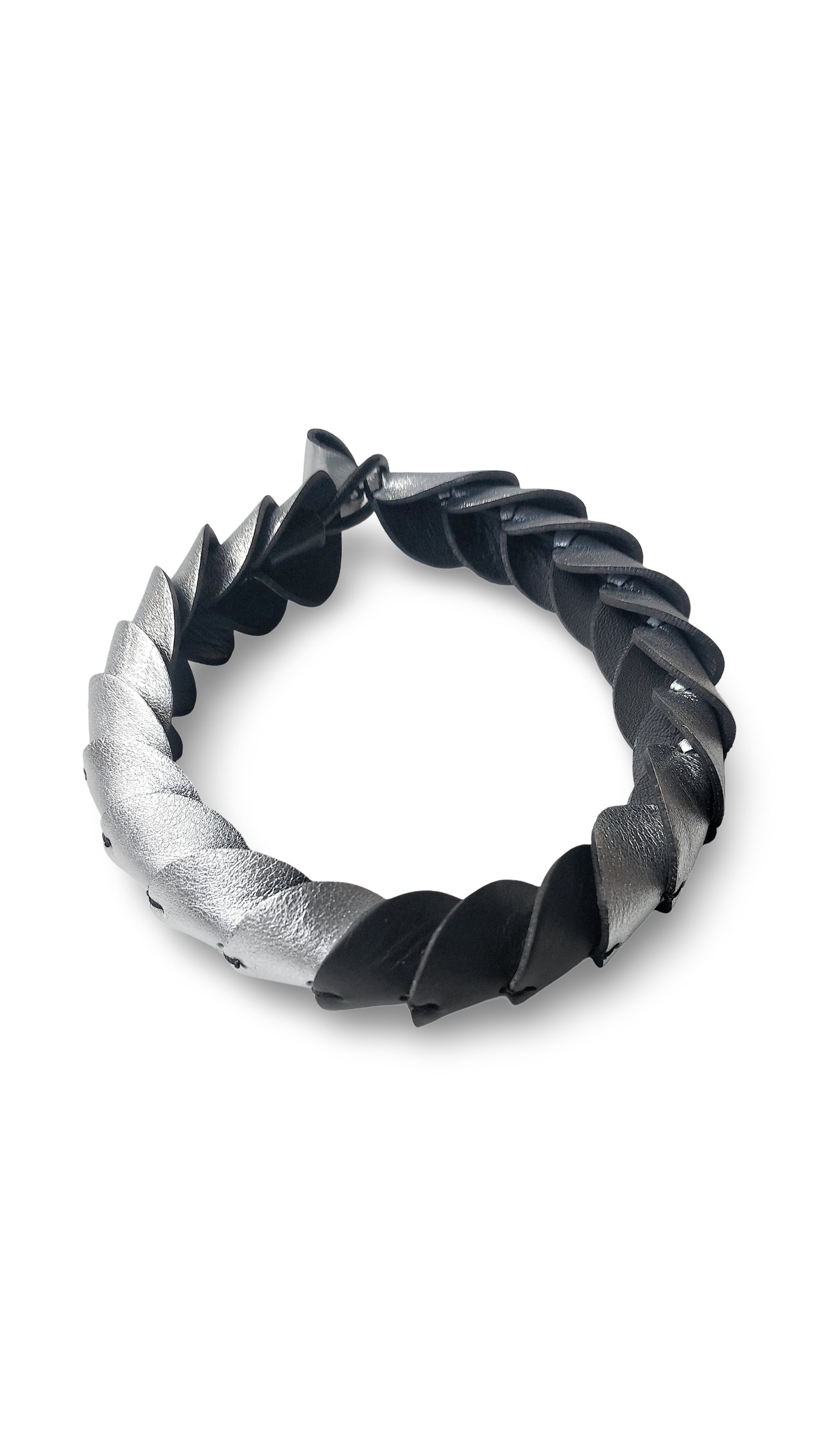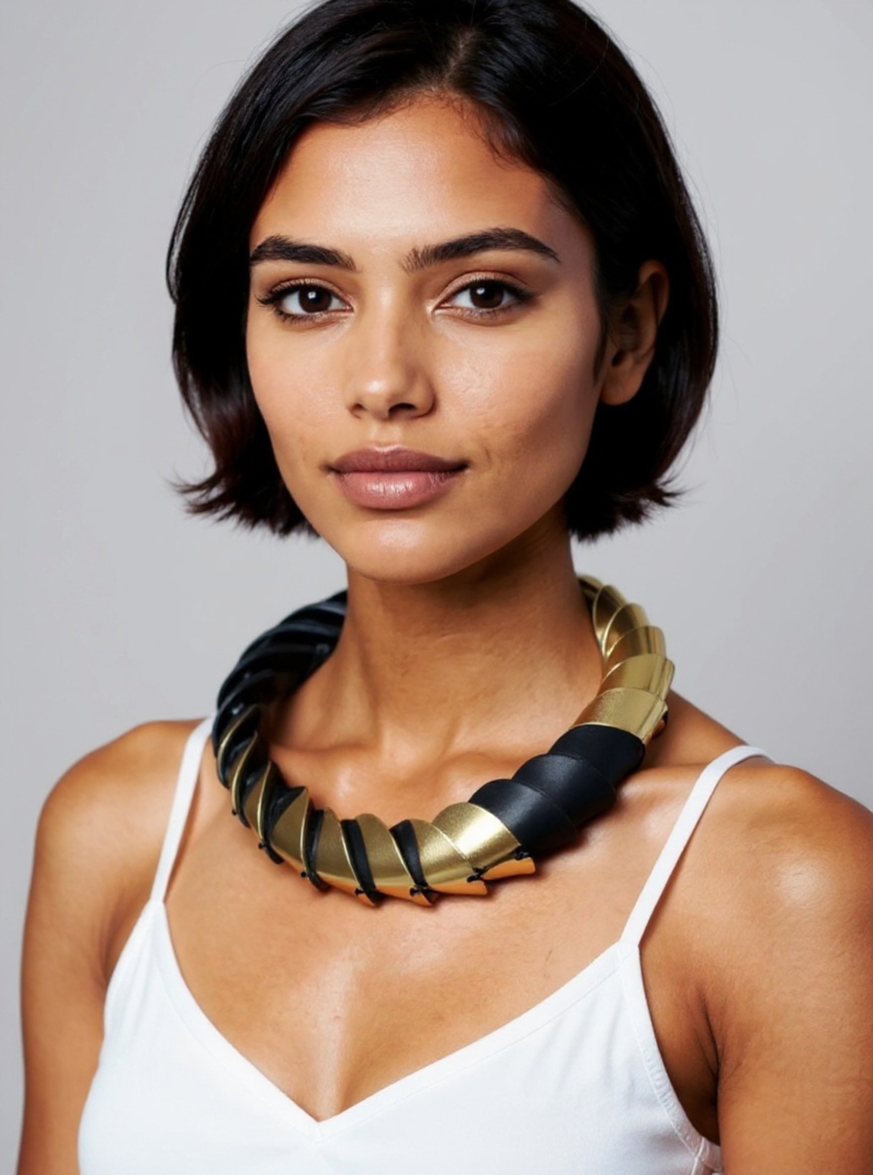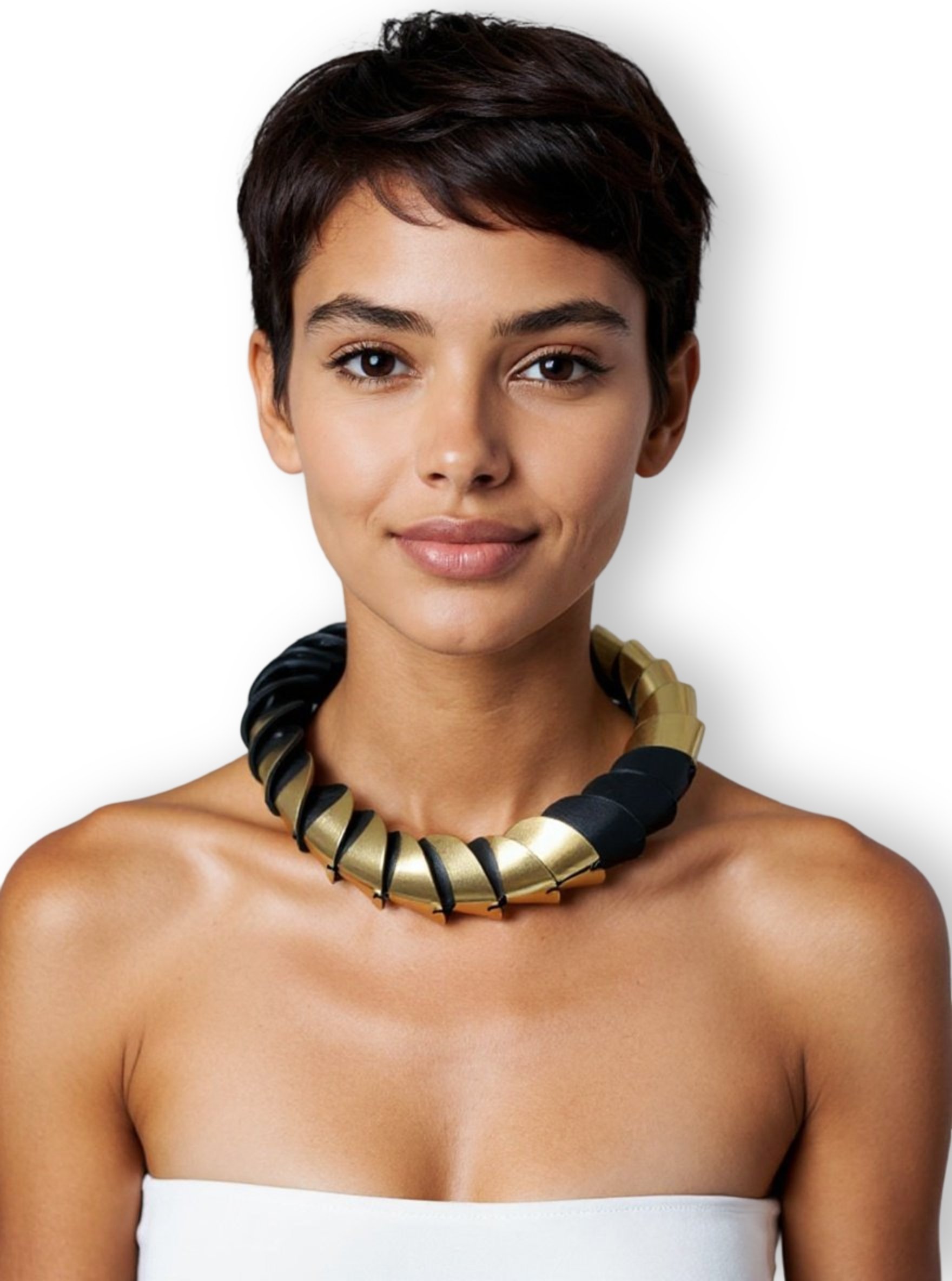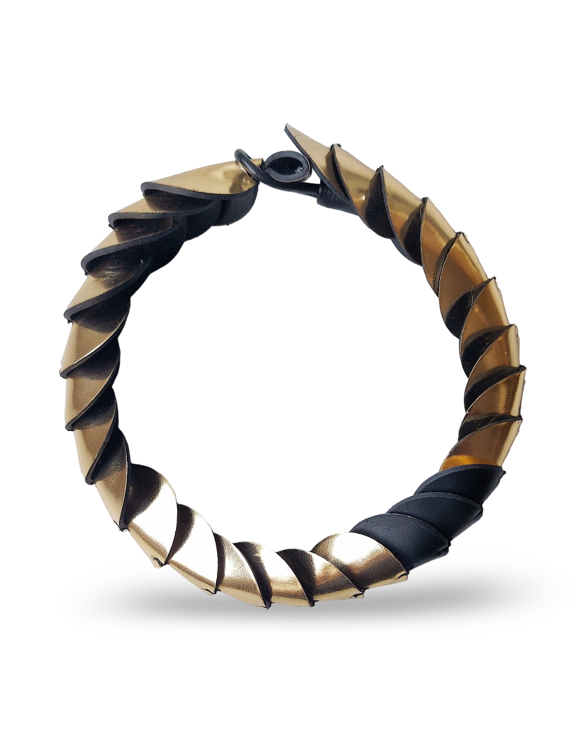 - A sculpted leather necklace with a powerful and contemporary style. It is handcrafted using soft, high-quality Italian leather, which is exclusively sourced from end-of-line stock and production scraps, as well as leather hide.