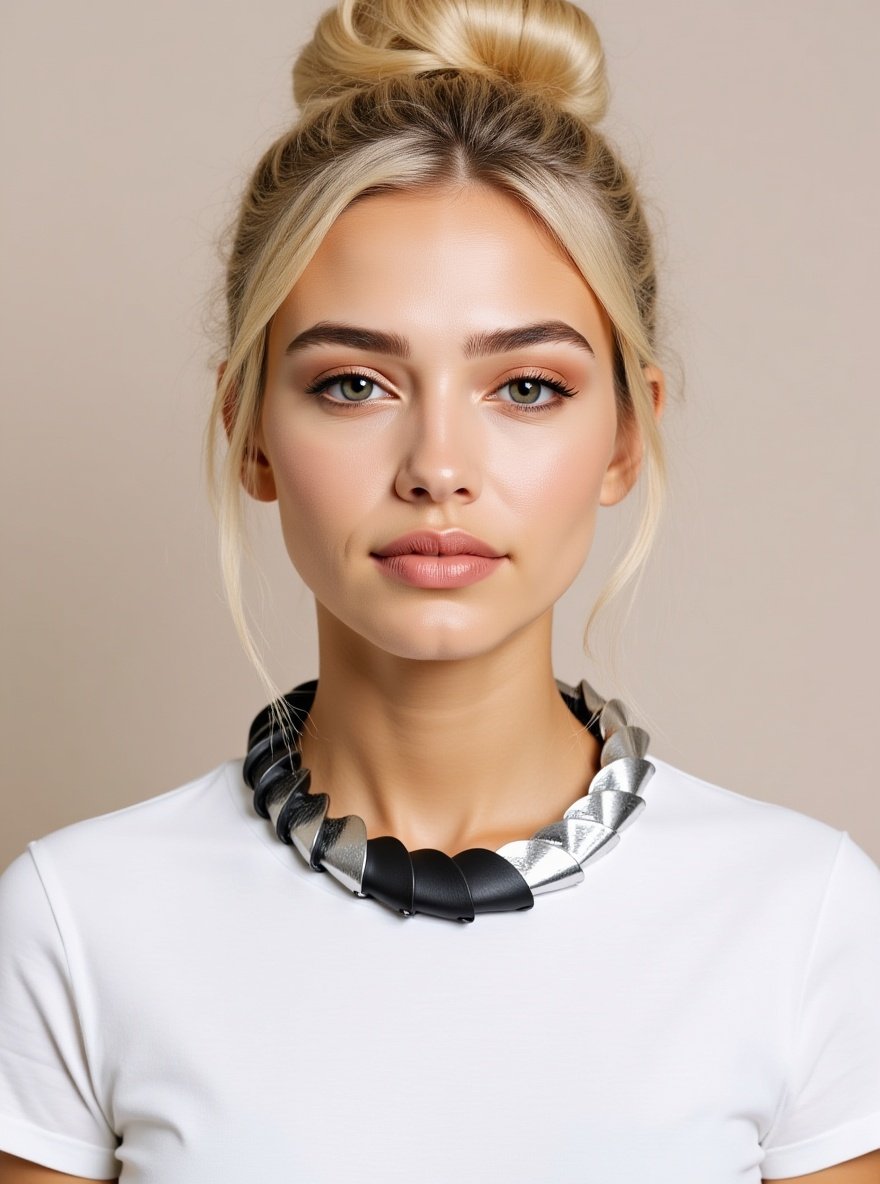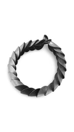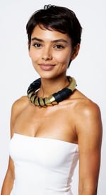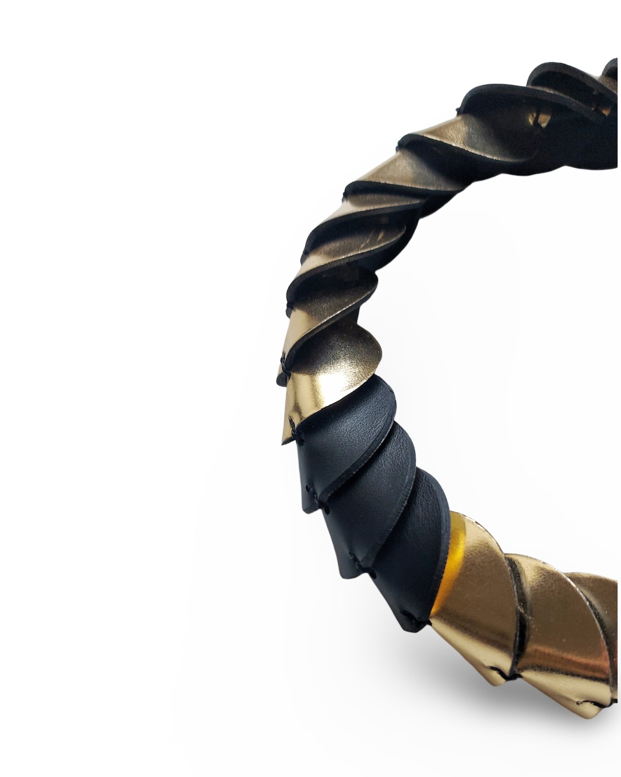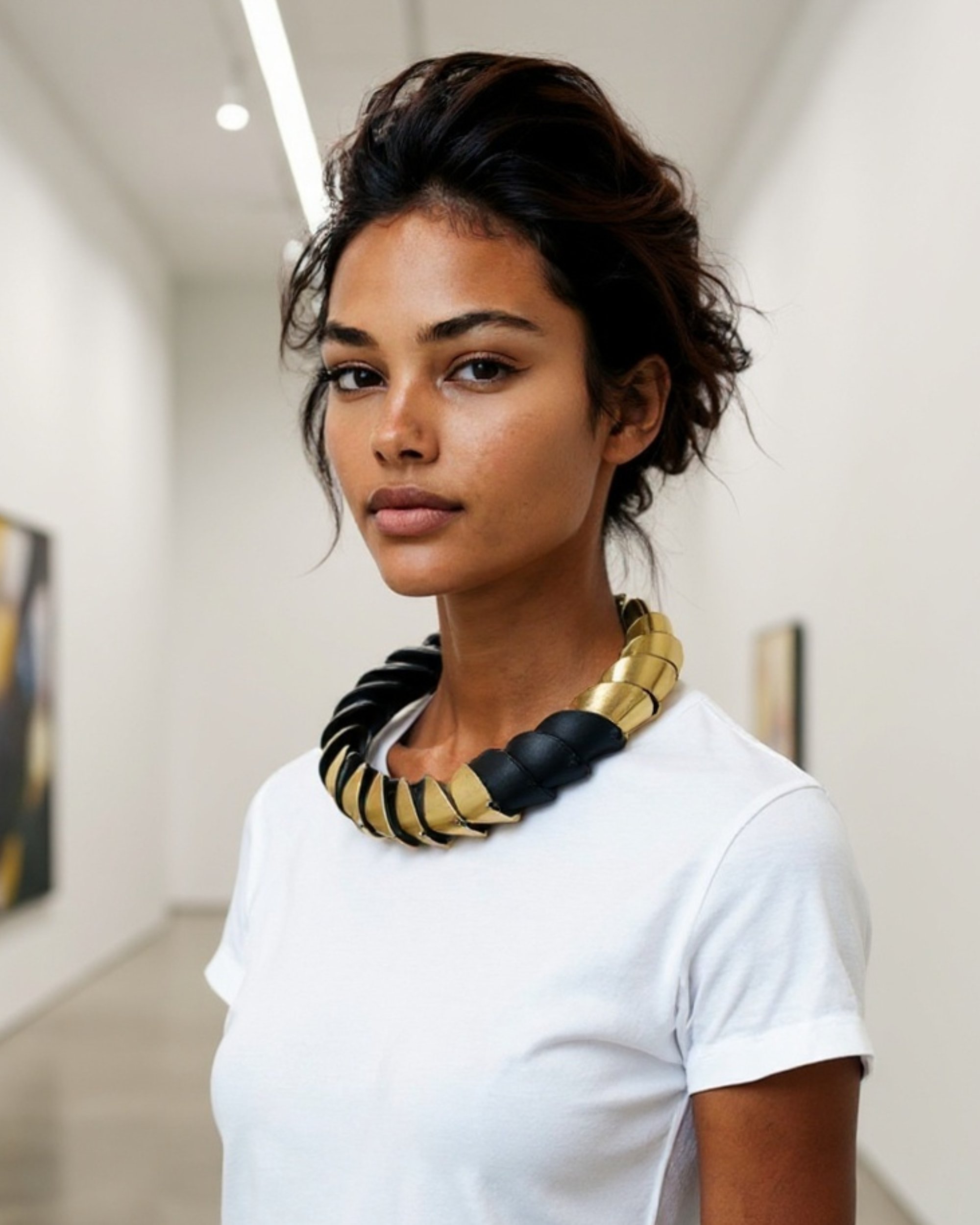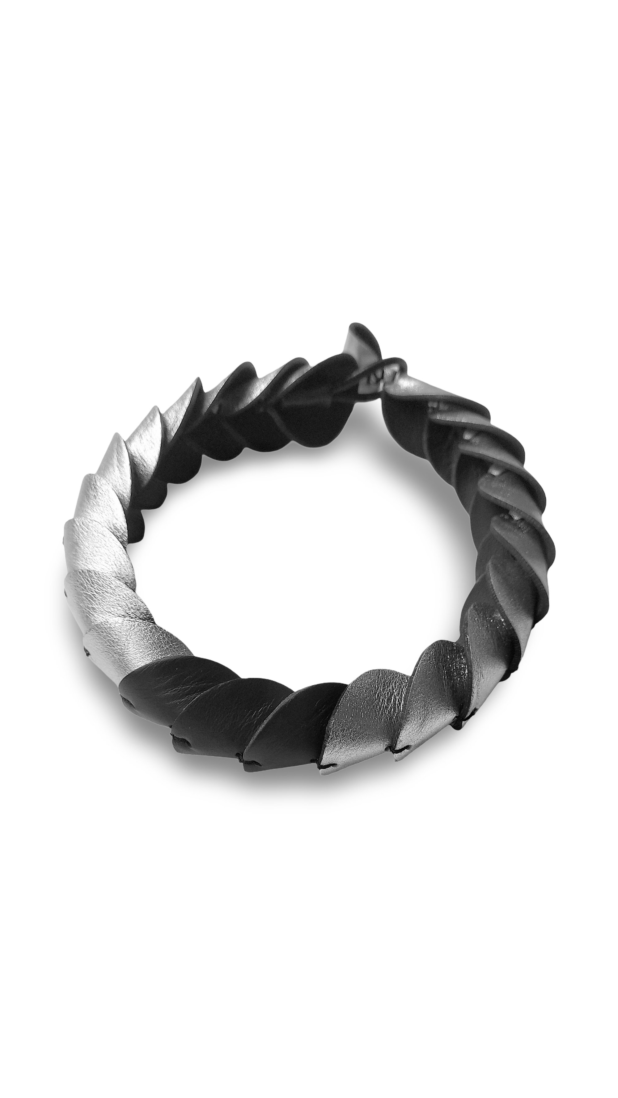 - A sculpted leather necklace with a powerful and contemporary style. It is handcrafted using soft, high-quality Italian leather, which is exclusively sourced from end-of-line stock and production scraps, as well as leather hide.