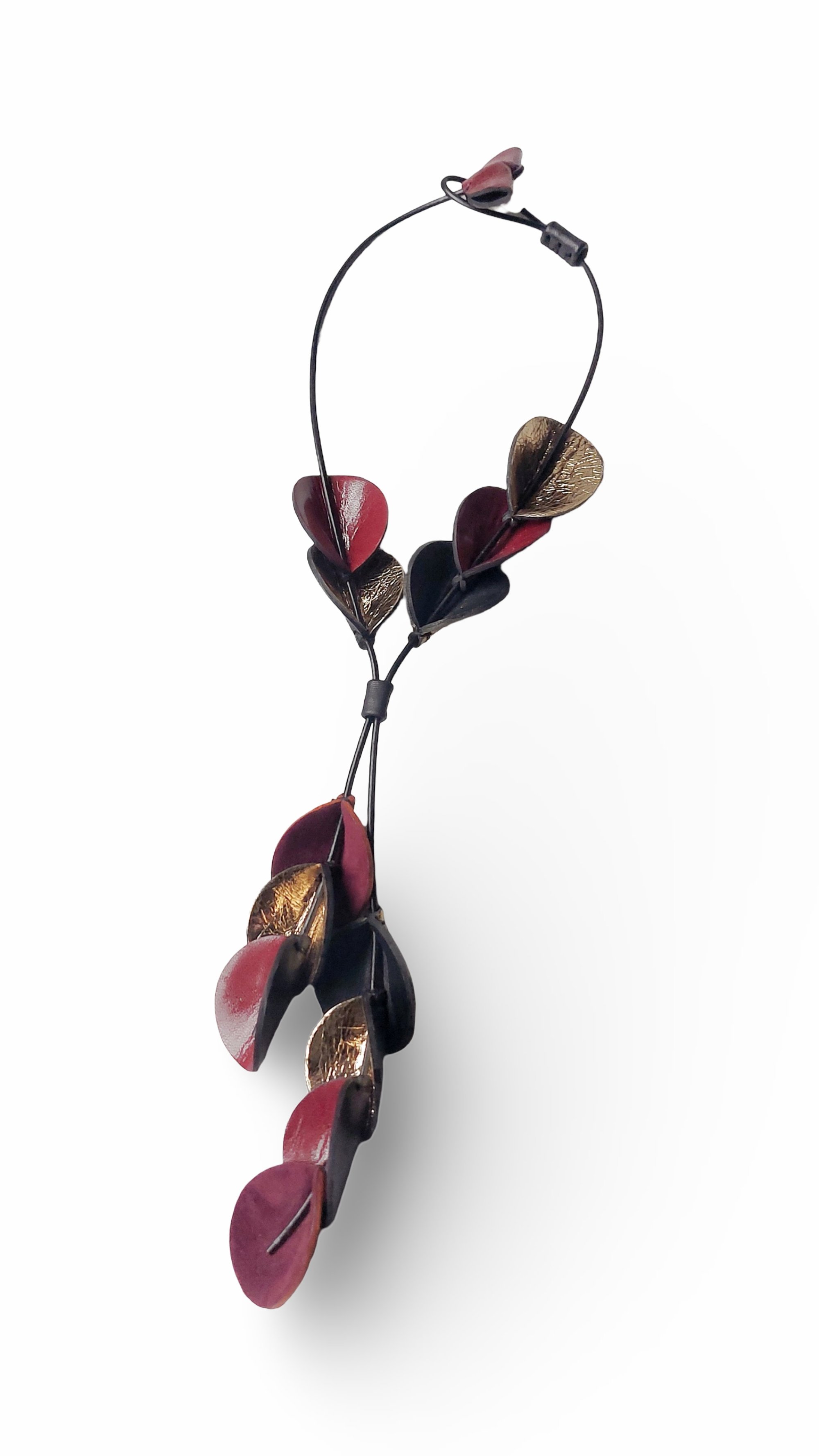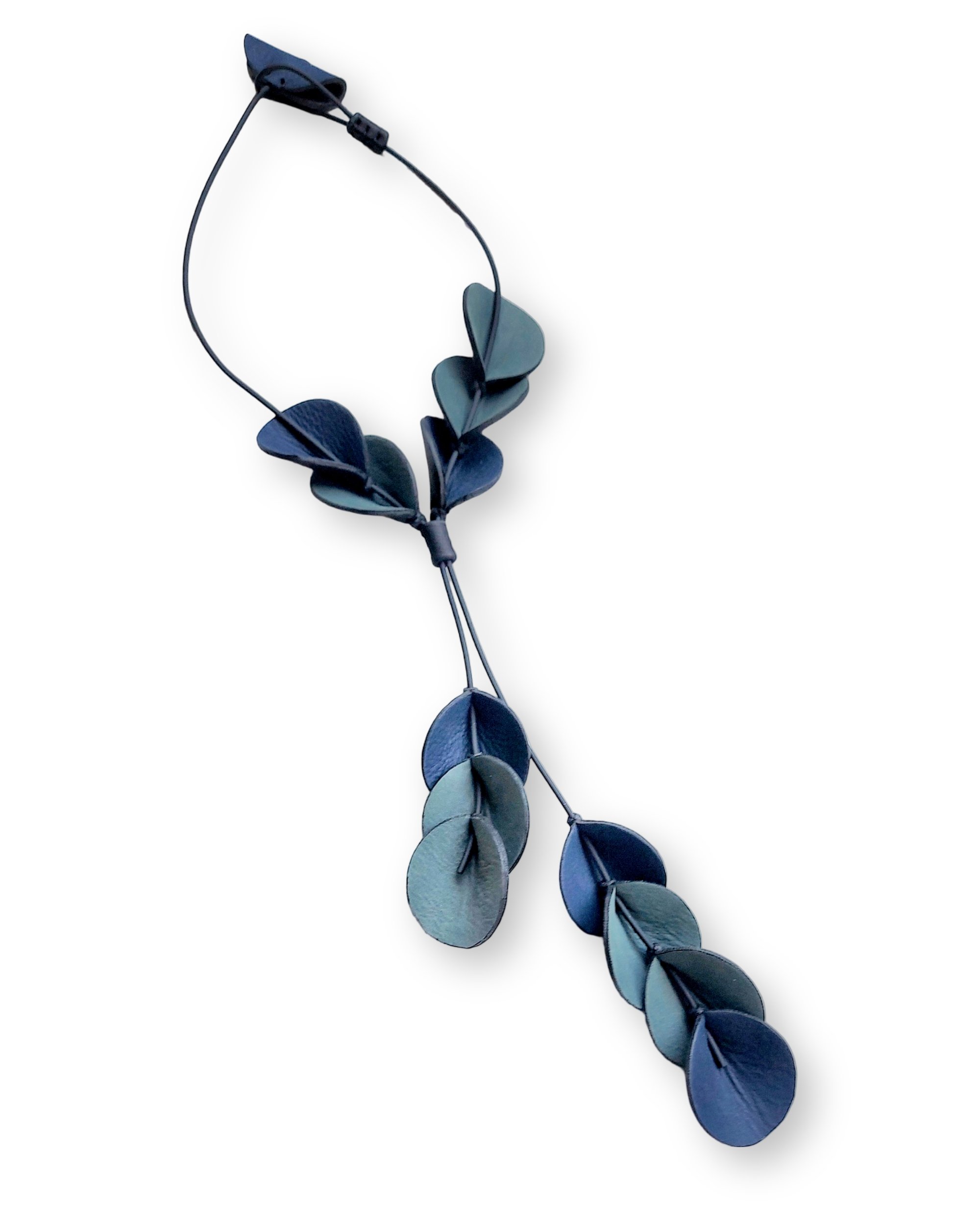 - Collana lunga scultura in pelle dallo stile elegante e leggero, nonostante il suo essere scenografica e impattante. E' realizzata artigianalmente con morbida e pregiata pelle italiana accuratamente selezionata e proveniente esclusivamente da stock fine serie e scarti di lavorazione e cuoio.