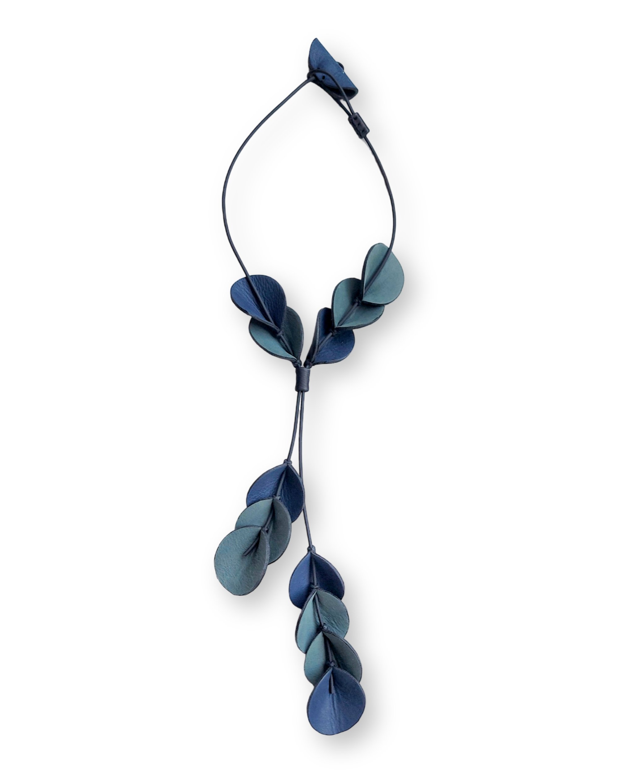 - A long sculpted leather necklace with an elegant and light style, despite its dramatic and impactful presence. It is handcrafted using soft, high-quality Italian leather, which is exclusively sourced from end-of-line stock and production scraps, as well as leather hide.
