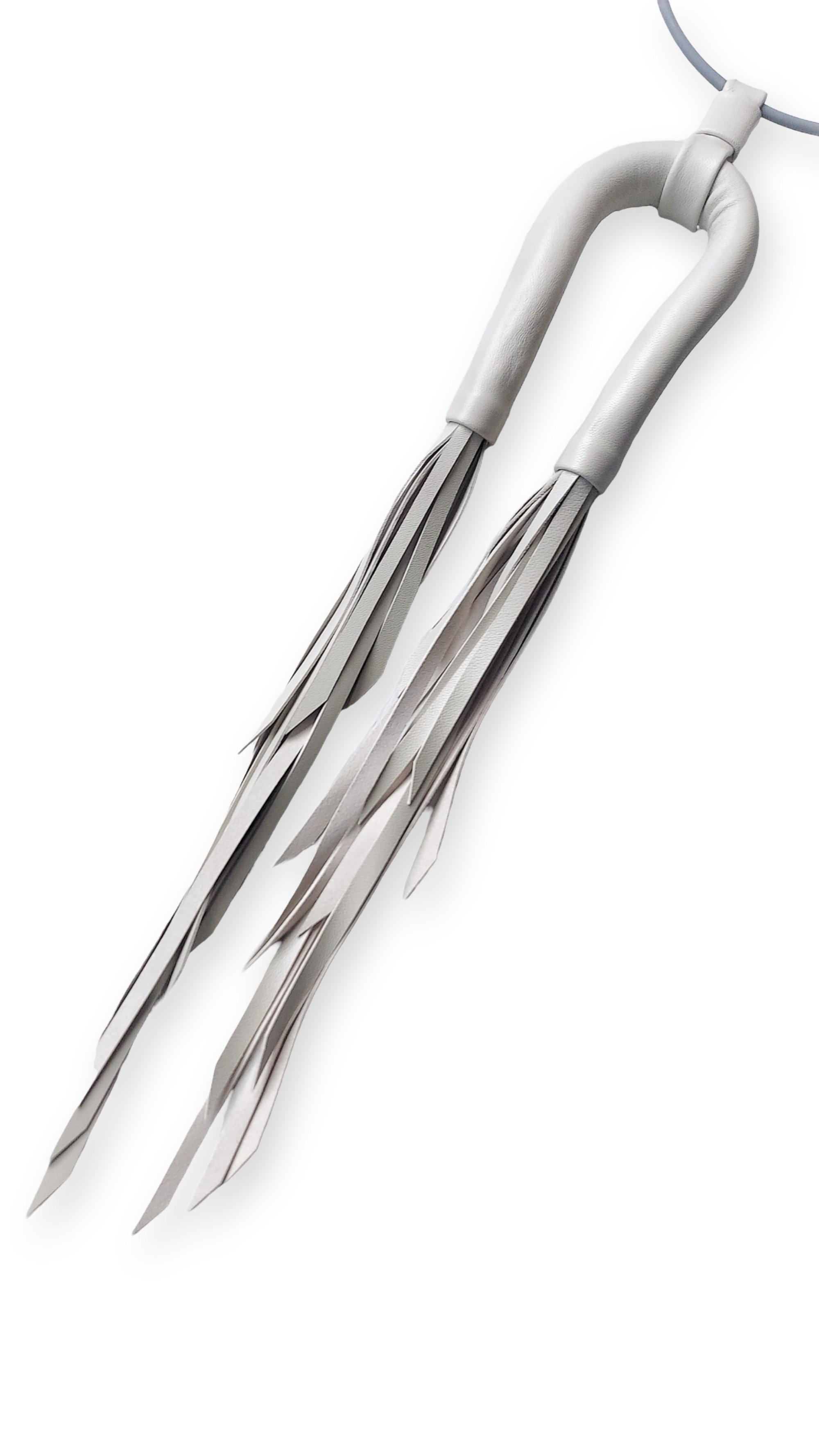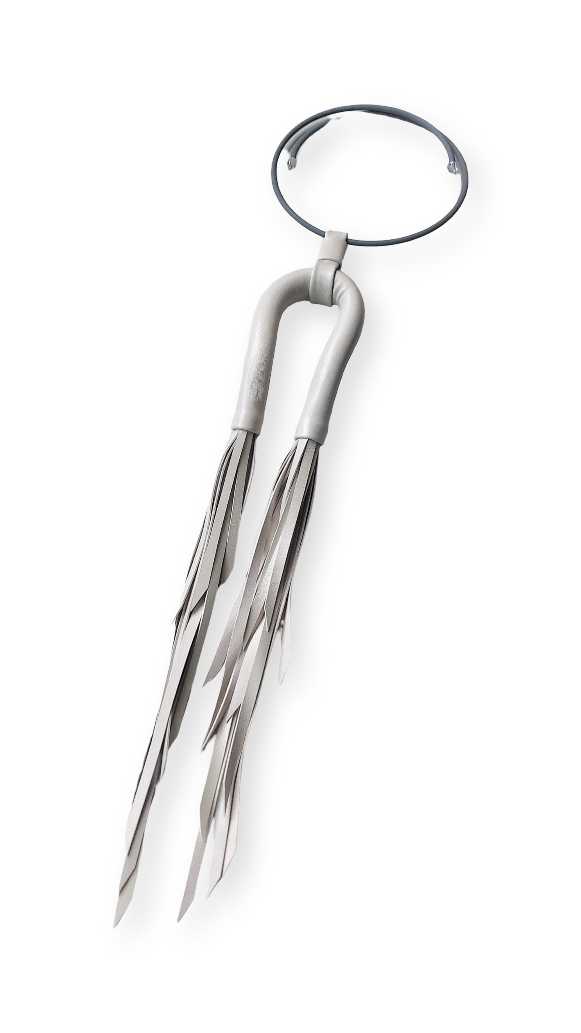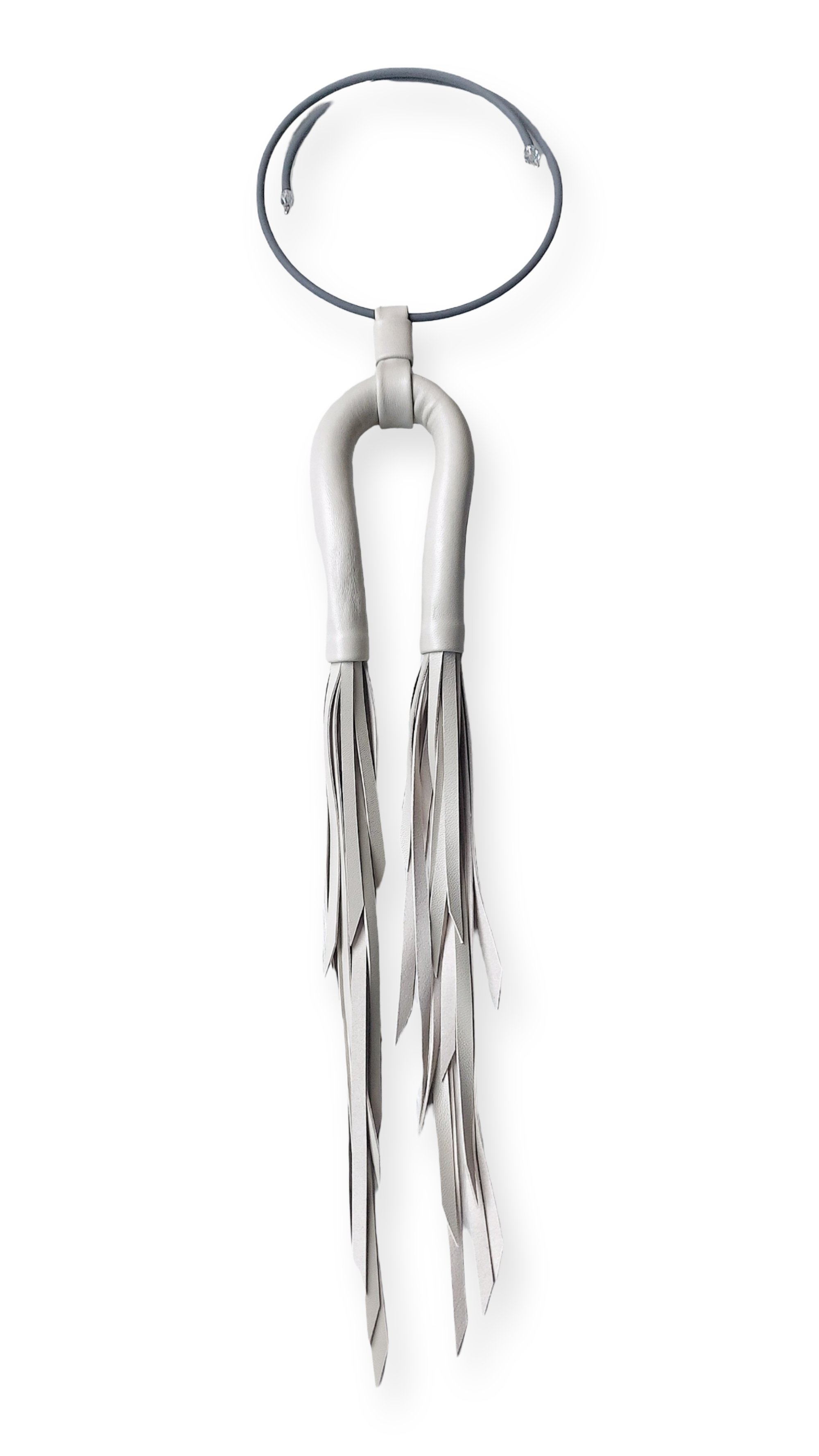 - The necklace features a flexible leather tubular structure, hand-stitched, with double tapered leather tassels. It is mounted on an elastic and adjustable choker made of harmonic steel and coated in rubber.