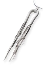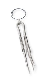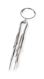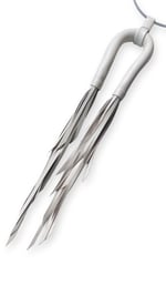 - La collana è caratterizzata da un tubolare flessibile in pelle, cucito a mano, con doppia nappa in pelle dal taglio affusolato. E' montata su un collarino elastico e regolabile realizzato in acciaio armonico e rivestito in caucciù.