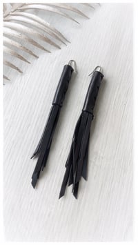 - The earrings feature slender leather tassels with tapered cuts and hooks in gold, silver, or gunmetal steel.