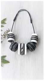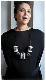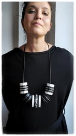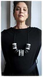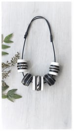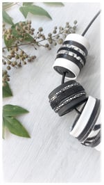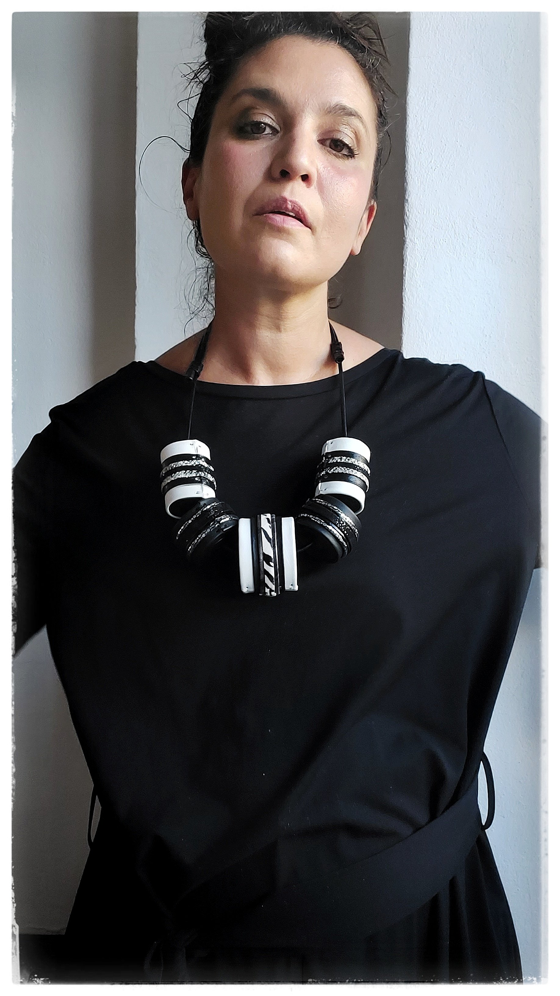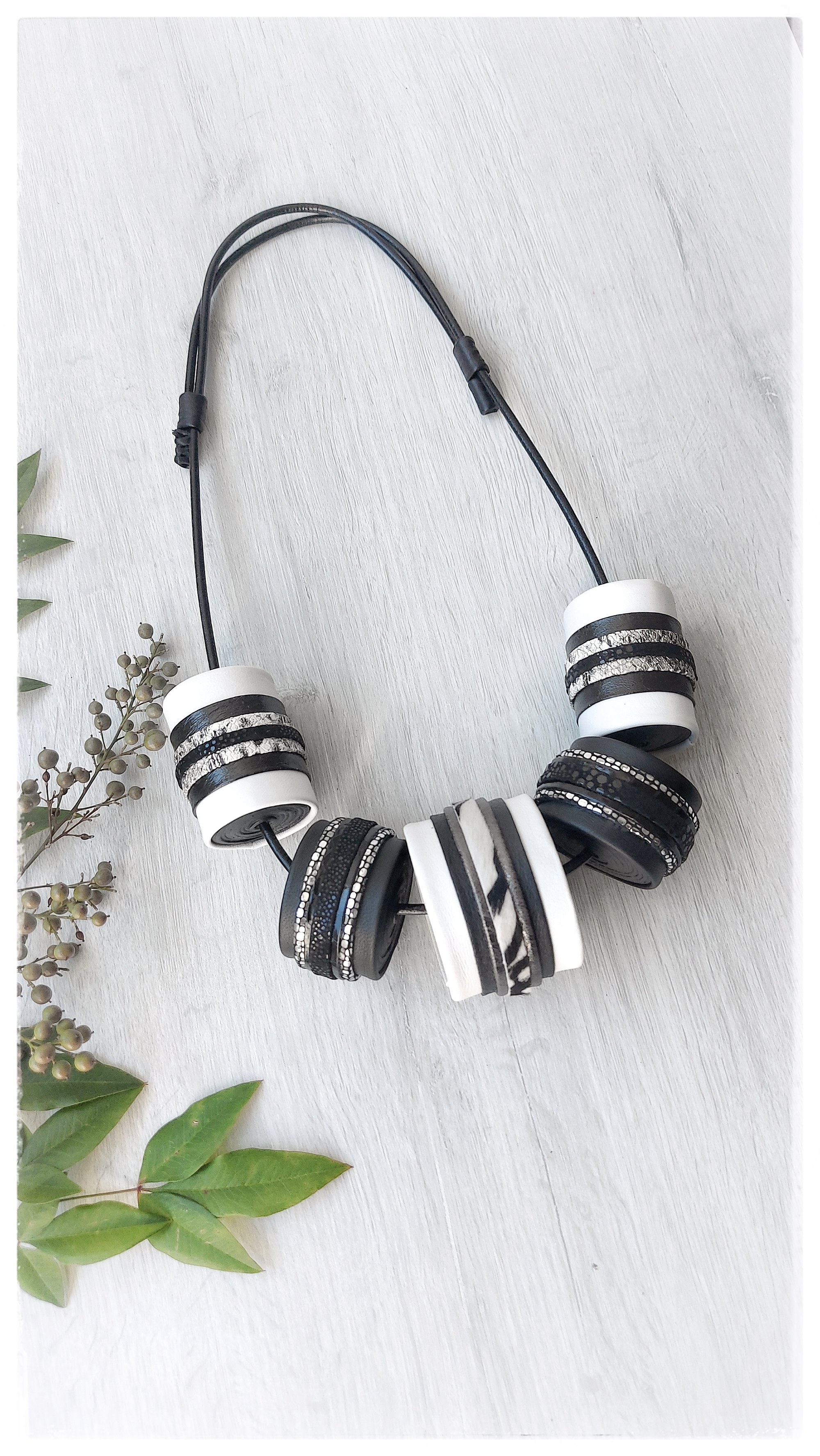 - cordino in cuoio nero, maxi perle vbianco e nero con inserti bianchi, argento, nero, cavallino zebrato.